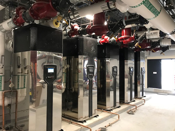845 Madison is a new construction project combining two apartment buildings with townhomes. The entire complex is heated using five 5,000mbh Camus DynaForce Boilers. The DynaForce is Camus’s fully condensing water-tube boiler. The boilers are vented using Metal-Fab’s Corr-Guard flue, specifically designed to be used with condensing appliances. The boilers were lifted by crane to the mechanical penthouse on the North tower.